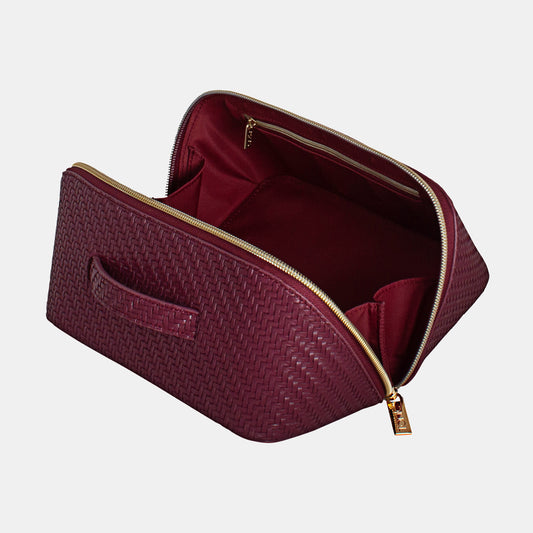 Crafted from an easy care vegan leather, the Herringbone texture elevates your beauty routine and travel experiences.