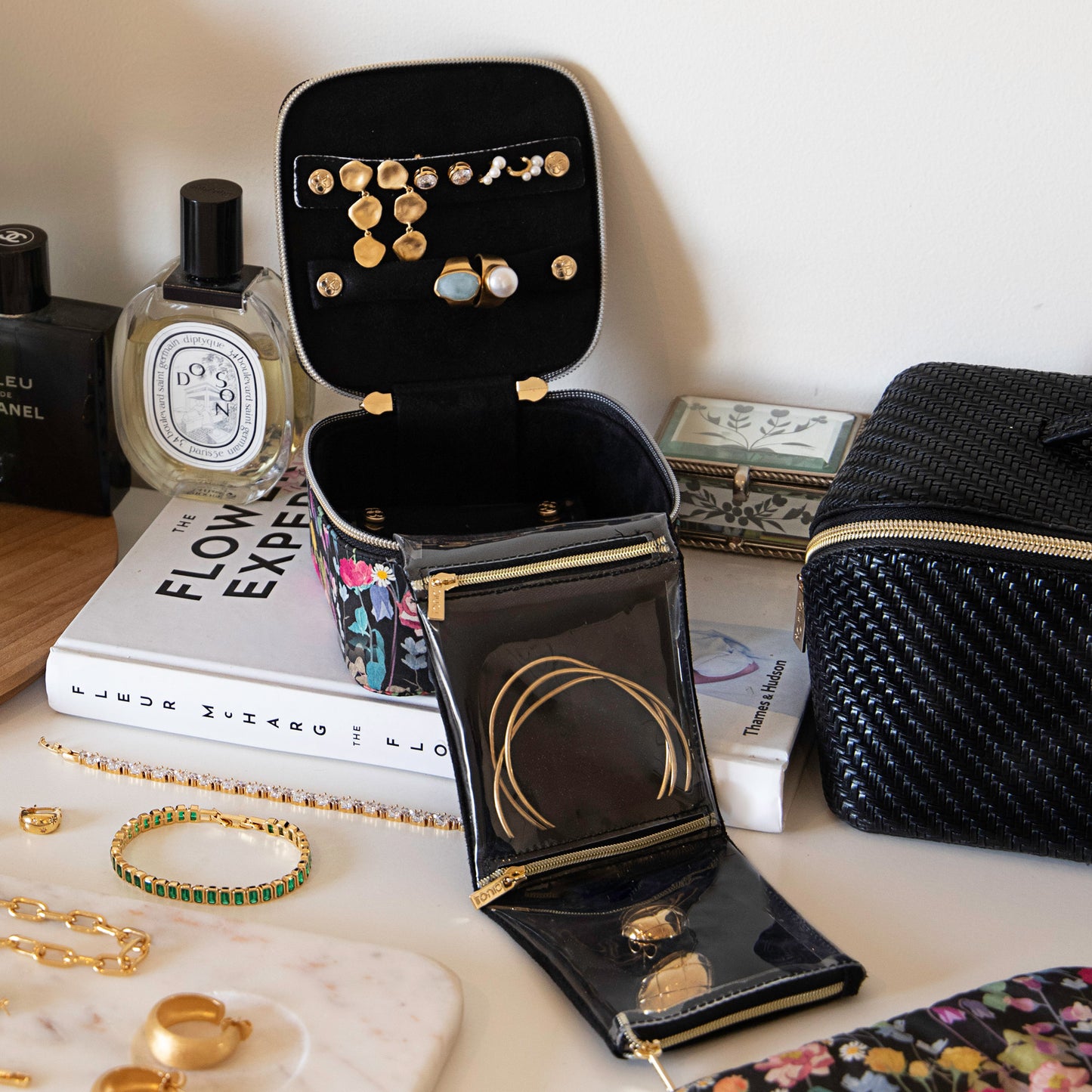 Protect your cherished pieces with the patented Jewellery Cube. Featuring the whimsical Liberty of London Fairytale Forest Tana Lawn™ print, double gold zips open to reveal a patented interior with detachable compartments, individual pockets, a ring holder, and earring holder. Keep your accessories tangle-free, secure, and beautifully displayed whether you're at home or on an enchanting journey.
