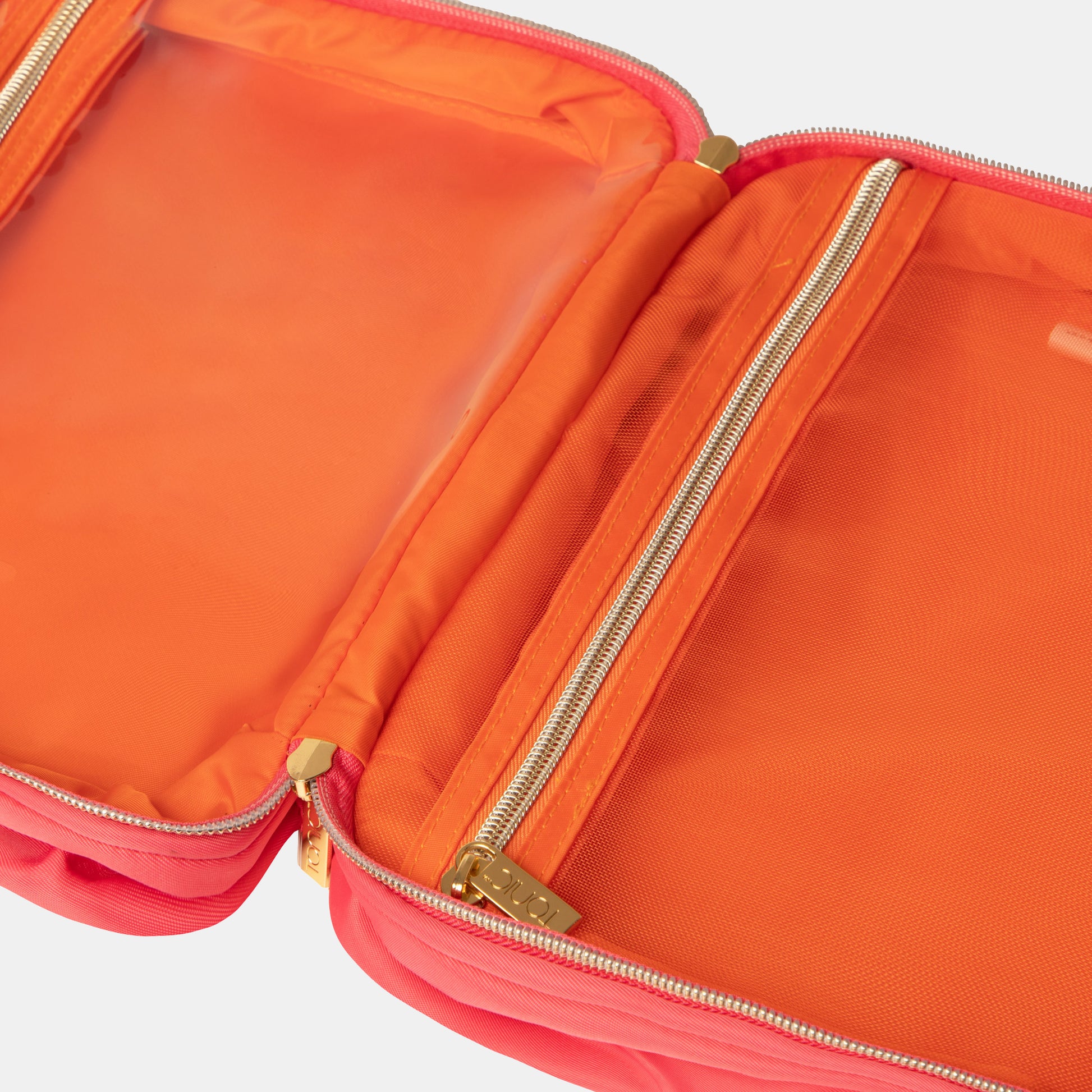 Crafted from practical water resistant recycled nylon, this hanging cosmetic bag features a playful contrast orange lining. The two generously sized compartments inside include a clear EVA window and a breathable mesh window. Large enough for your entire toiletry collection, additional pockets inside and out ensure your smaller items are safely stored.