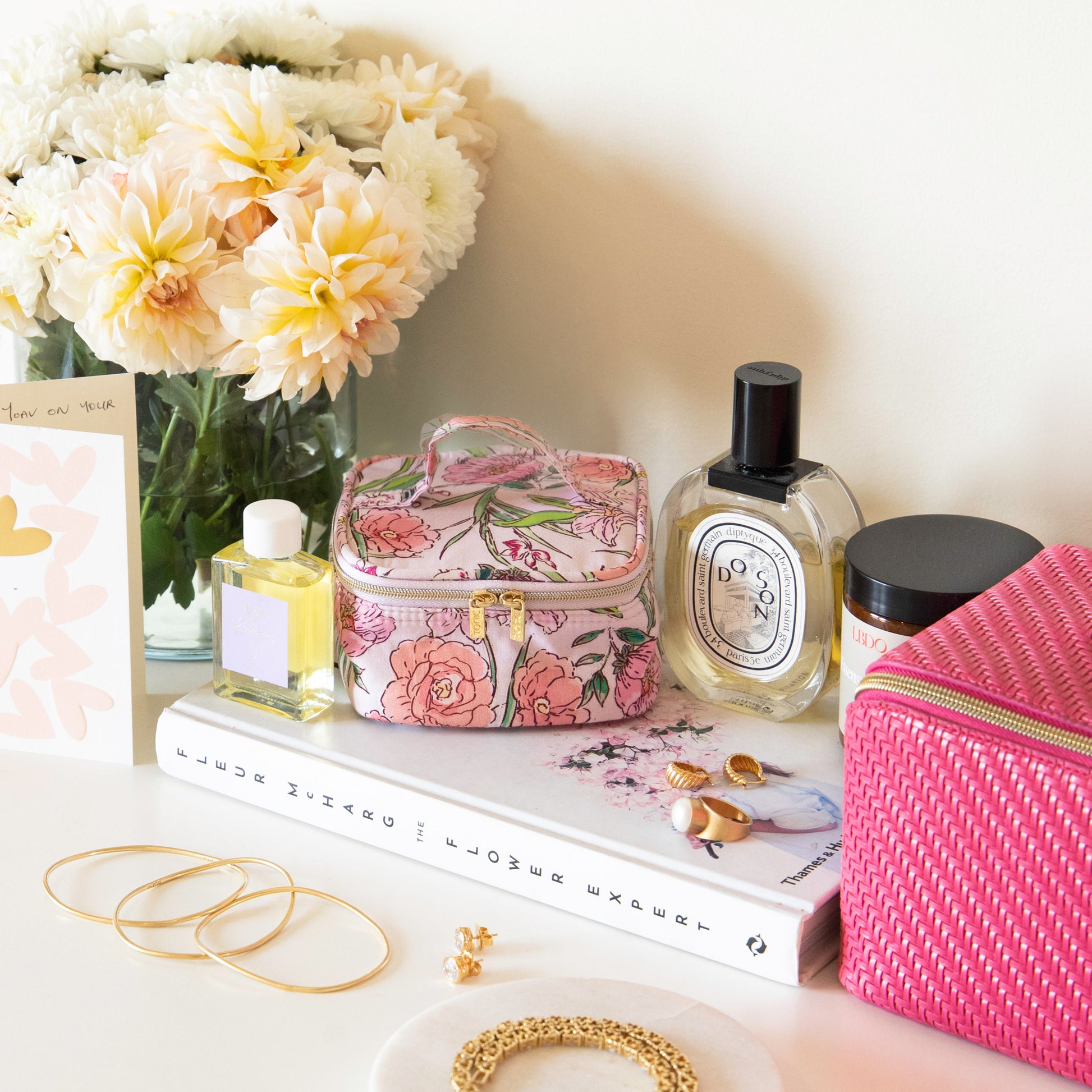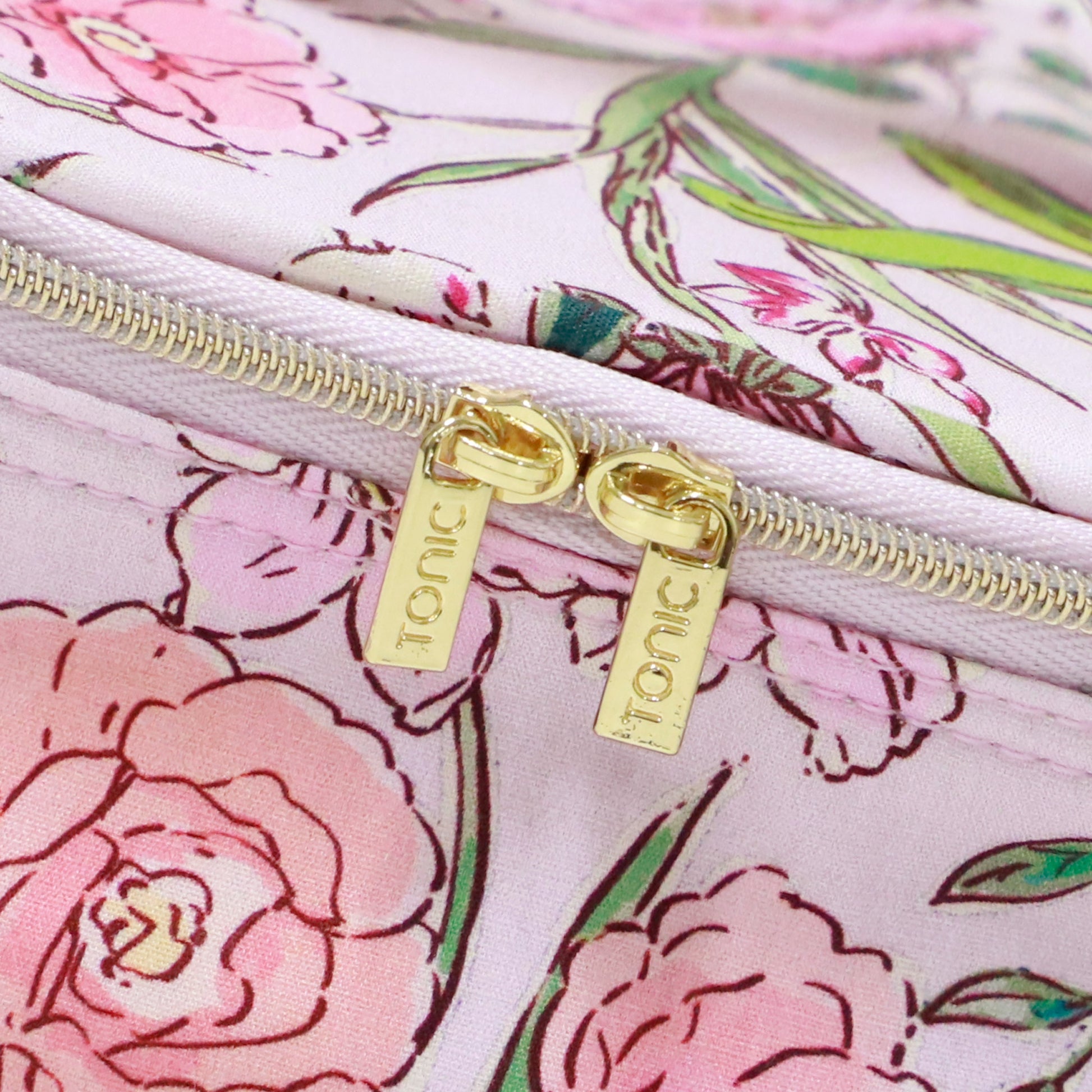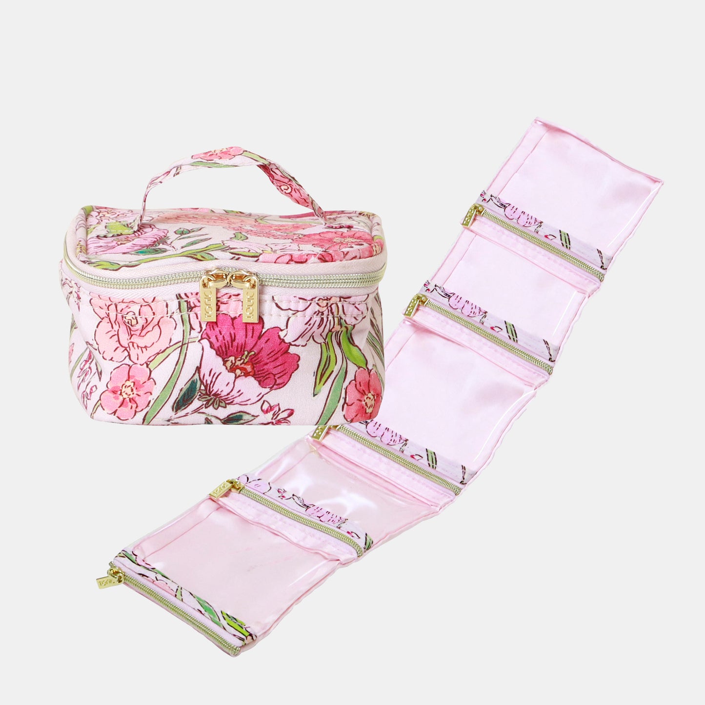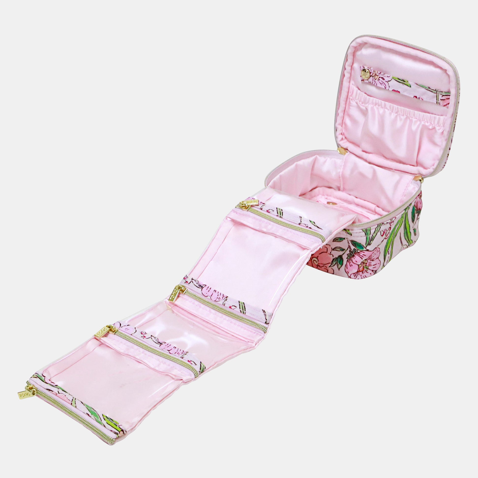 Pretty as a picture, the trademarked Jewellery Cube in Fleur Rose is the perfect way to keep your favourite jewellery items organised in style. Printed on sustainable cotton, the Fleur design features a bouquet of lilies, hibiscus and foliage in shades of pink, coral and soft green. Opening to a smooth satin lining in matching soft pink, the cube's trademarked accordion pockets with clear windows are detachable from the base allowing you to take just this section with you when space is limited. A ring holder and two elasticated pockets complete this thoughtfully designed jewellery case. It's not just for jewellery though, the pockets can also be used to keep sewing notions close at hand for the craft enthusiast or to keep charging cords separated and tangle free.