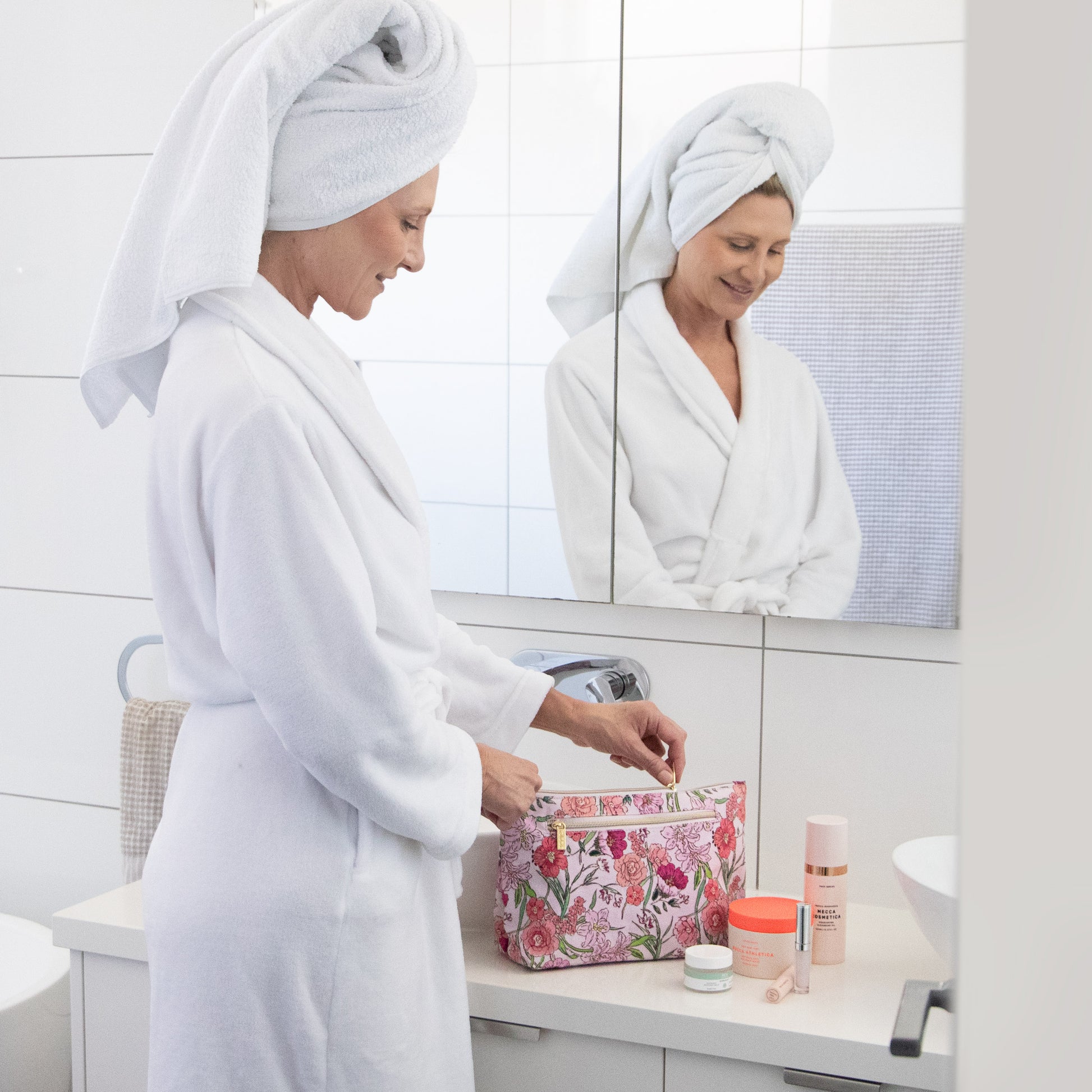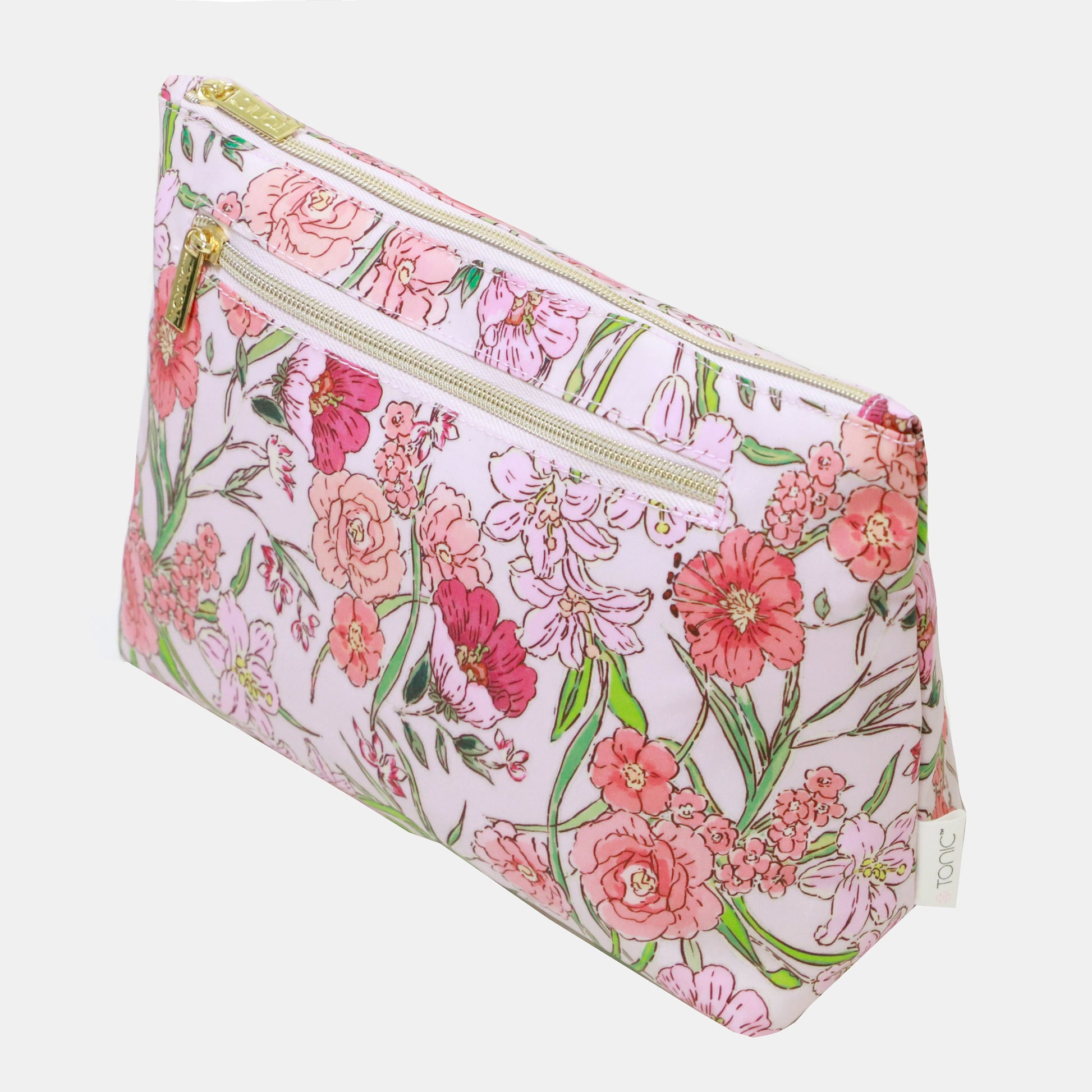 Be ready for your next adventure with the Large Cosmetic Bag in Fleur Rose. Printed on sustainable cotton then coated in PVC for enhanced water resistance and easy care, this enchanting floral design features a bouquet of lilies, hibiscus and foliage in delicate shades of pink, coral and soft green. Complemented by our signature gold zips, this toiletry bag opens to reveal an interior lined with soft pink recycled polyester. The four pockets inside are perfectly sized for keeping smaller makeup or toiletry items organised with the outer pocket designed for those essentials you wish to keep close at hand.