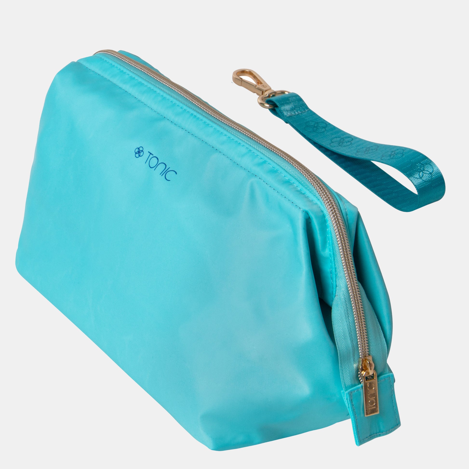 Take inspiration from your favourite seaside destination with the soft and squashable Large Splash Makeup Bag in bright Aqua. Featuring a contrast lining in elegant Navy, this cosmetic bag is crafted from water-resistant recycled nylon making it ideal for use poolside or by the beach.