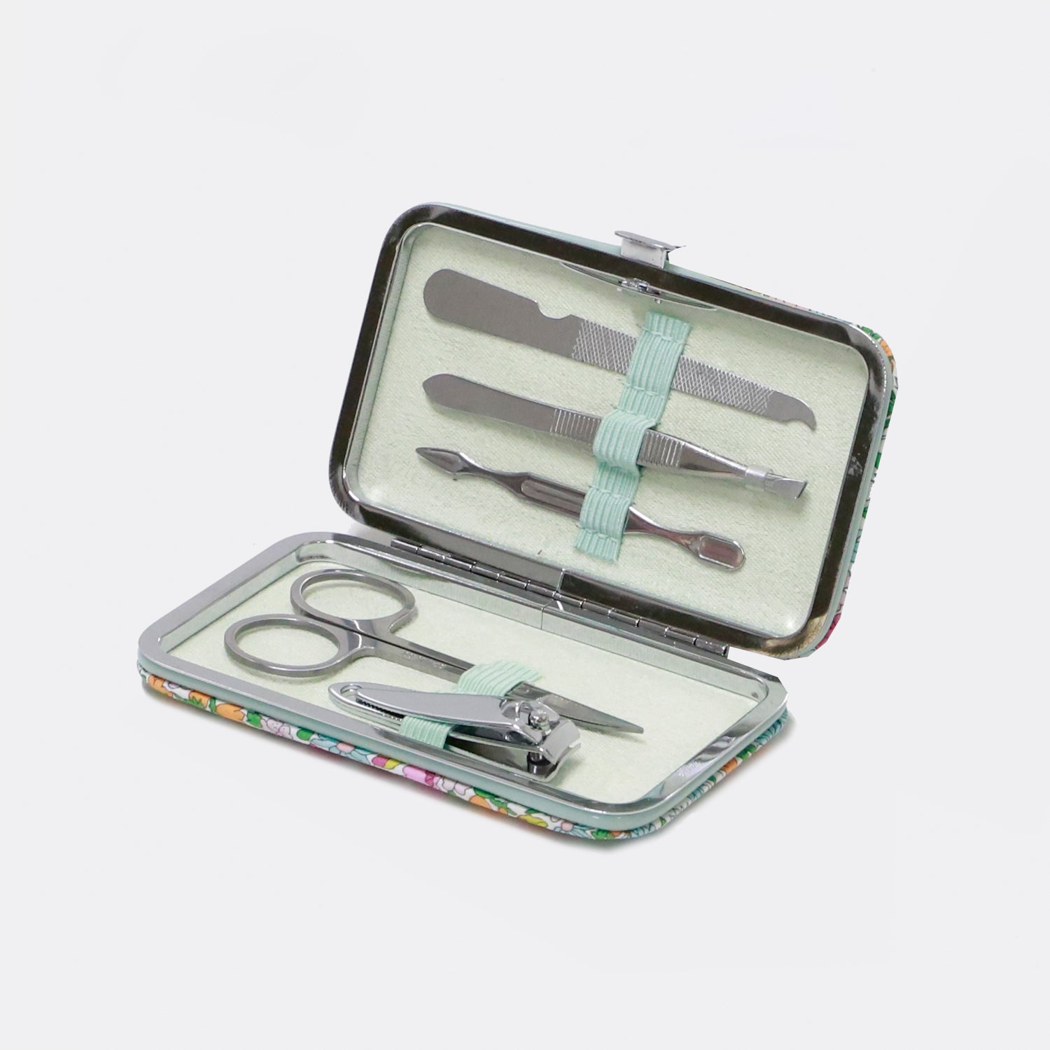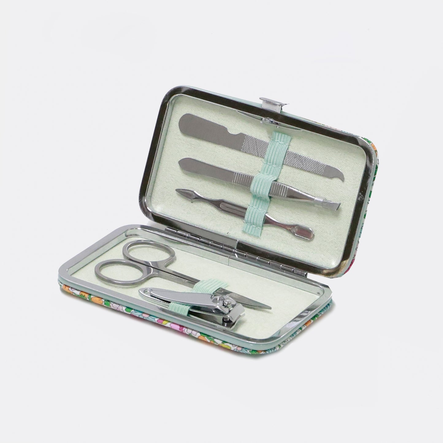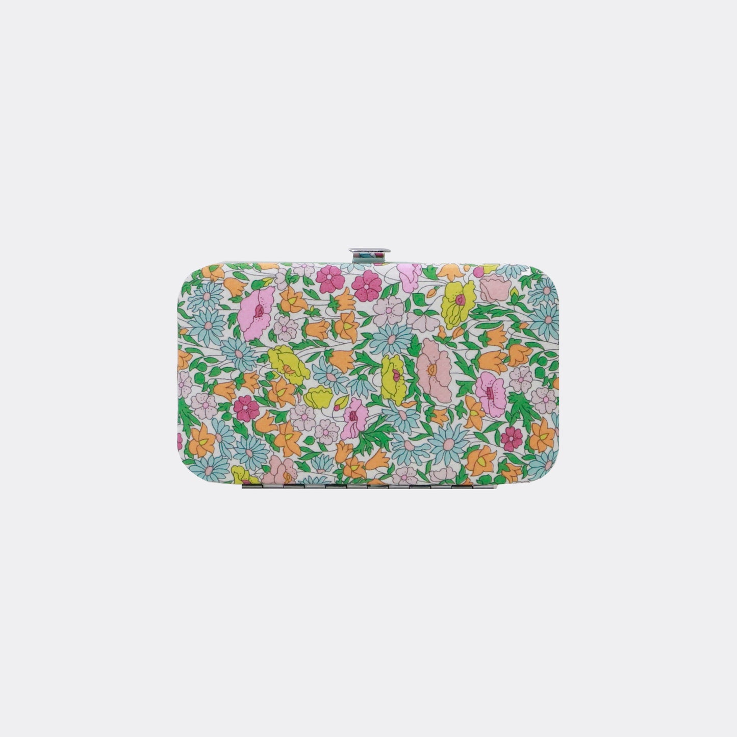 Bright and playful, this Liberty Poppy print Manicure Set will never be lost in your handbag! Be ready for any small manicure and beauty emergency with these premium quality tools housed in a clasp finish case and securely held in place with elastic loops. The smooth Liberty Tana Lawn™ cotton cover is highlighted with an elegant silver clasp.