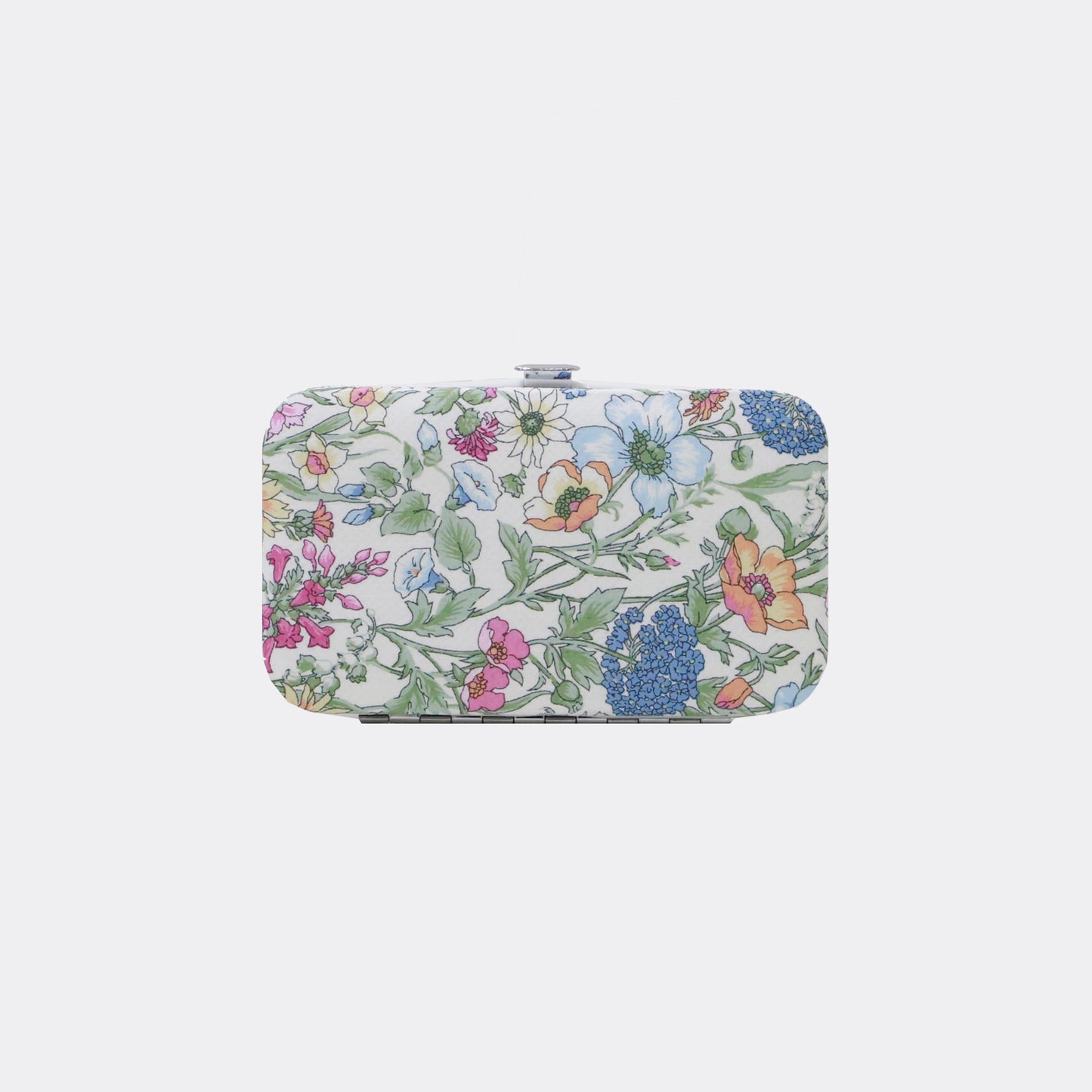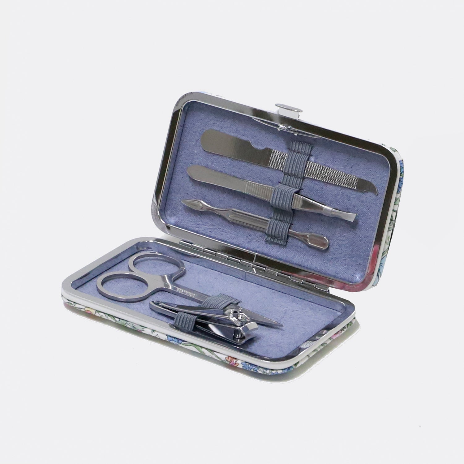 Featuring premium quality tools and a smooth Liberty Tana Lawn™ cover in the elegant blue toned Rachel design, this Manicure Set will solve any manicure and beauty emergency while on the go. Perfectly sized for your handbag, each tool is kept in place with elastic loops while the clasp closes securely to ensure you never lose your pieces.