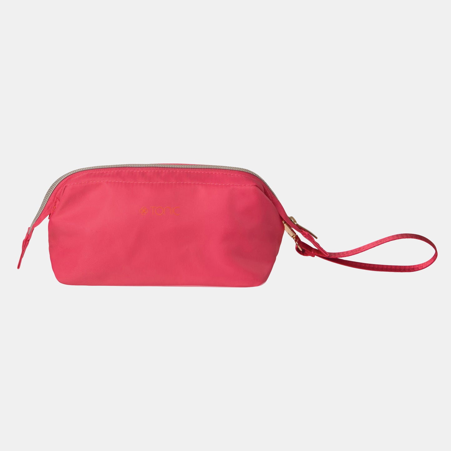 Fun and playful, this bright pink cosmetic bag has a contrast orange interior and is crafted from recycled nylon. Finished with a gold zip and a detachable webbing strap, this makeup bag is splash resistant and ideal to keep your poolside essentials close at hand on your next holiday.