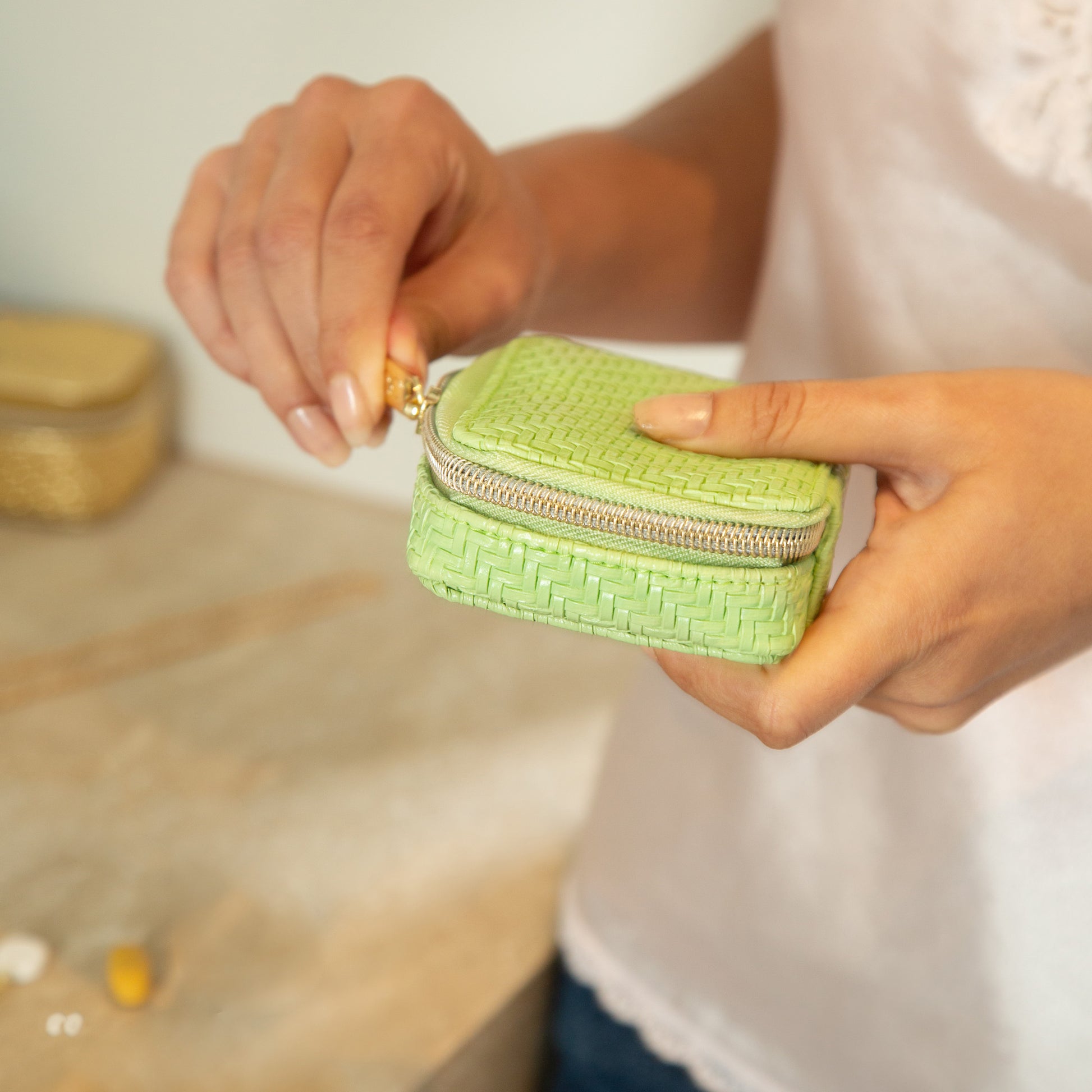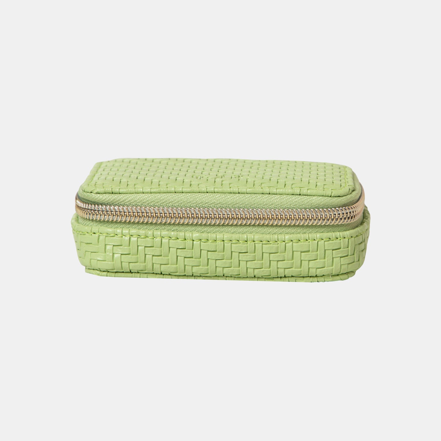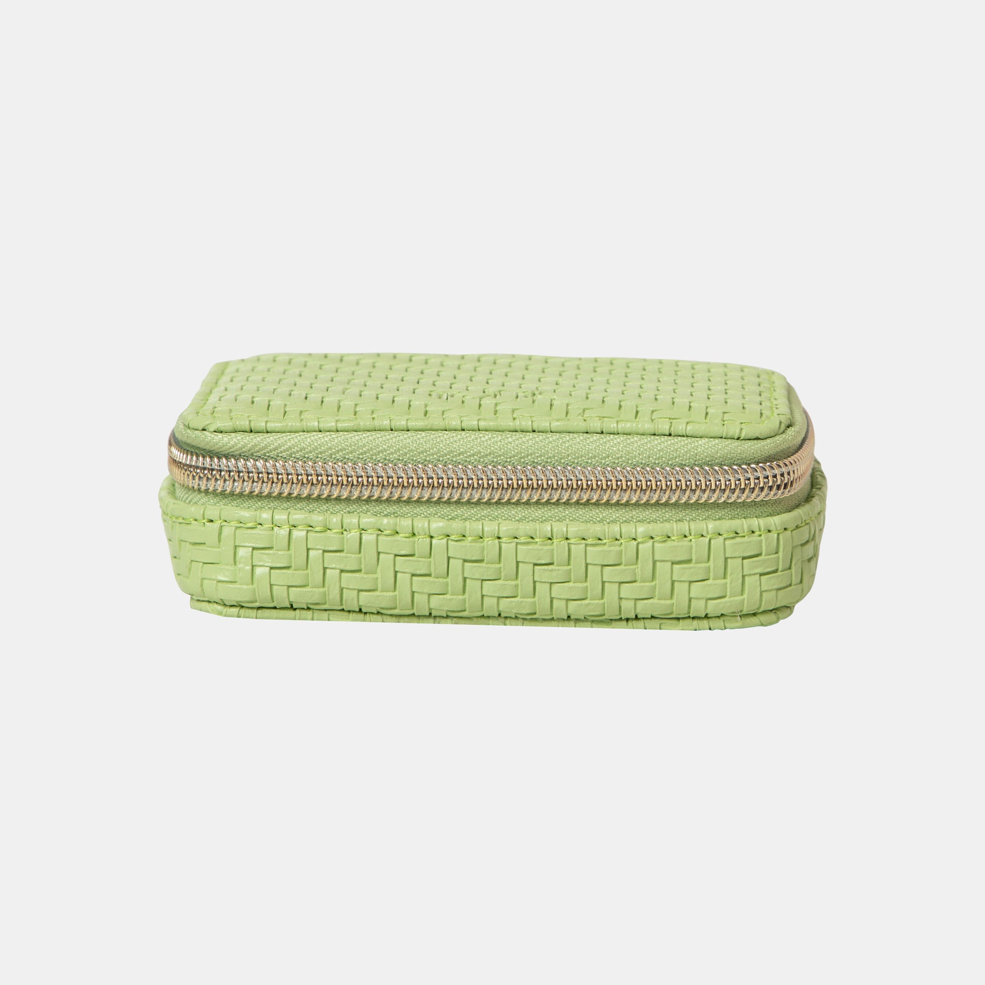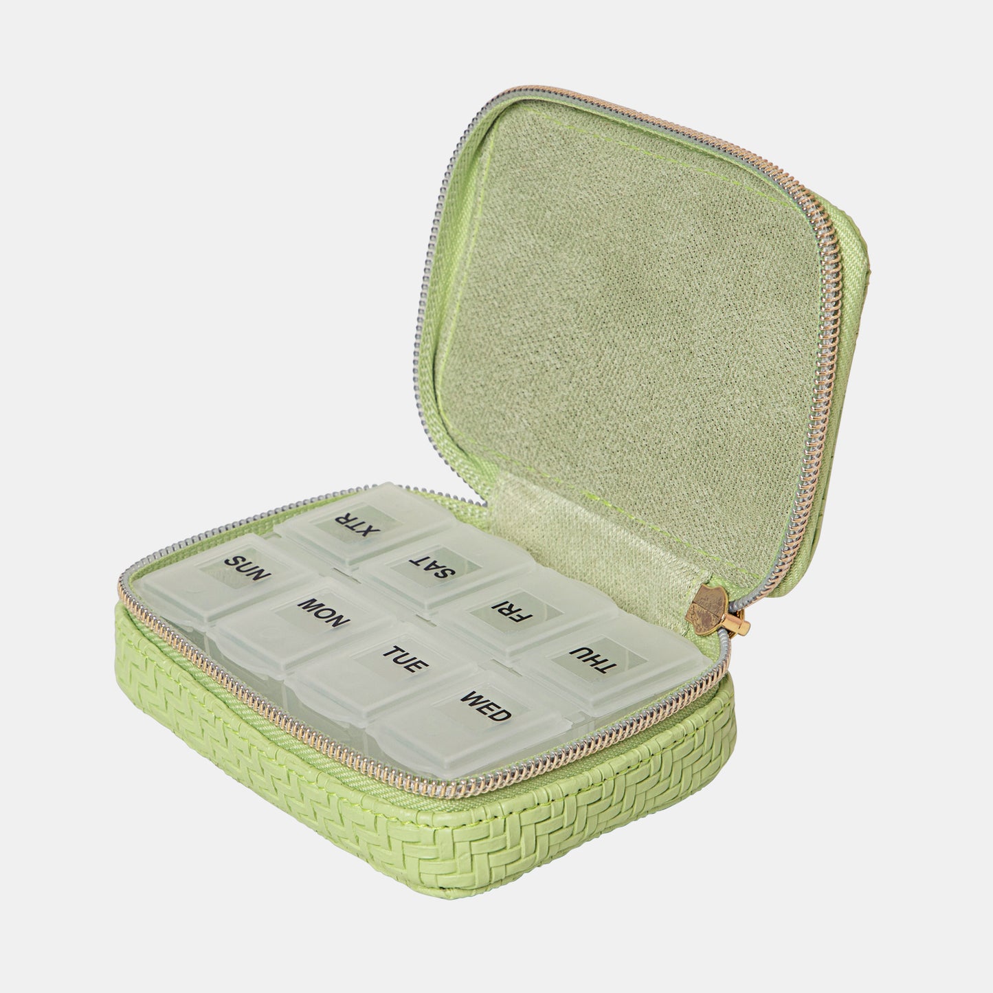 Elevate your daily vitamin and medication regimen with the Herringbone Pill Box. Featuring a herringbone textured outer in playful Pistachio green and an elegant gold zip closure, this pill box is a beautiful way to keep your wellness routine organised.