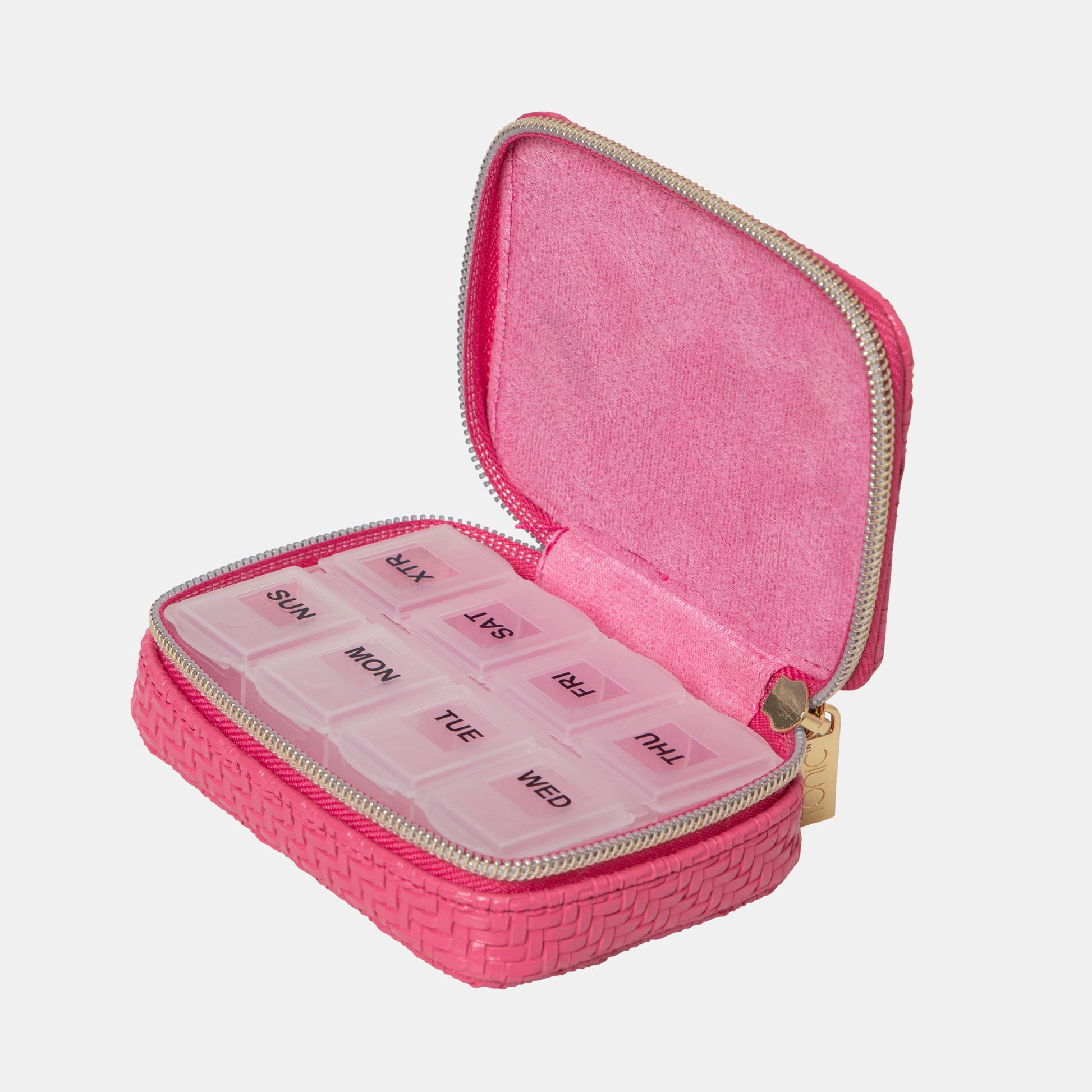 Elevate your daily vitamin and medication regimen with the Herringbone Pill Box. Featuring a herringbone textured outer in bright Raspberry, you'll never lose your essentials again!
