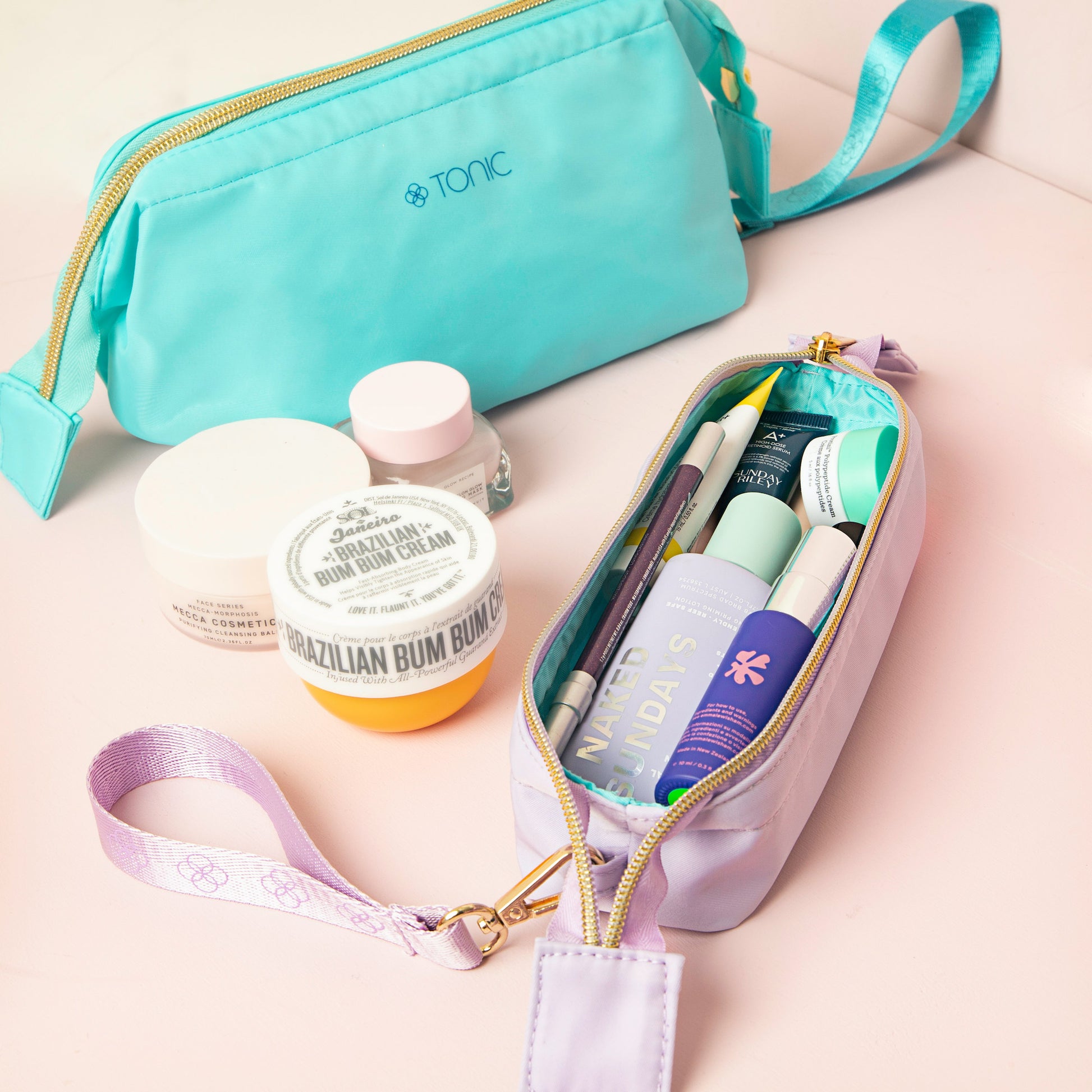 Crafted from water-resistant recycled nylon, this small cosmetic bag features a vibrant aqua interior and a unique metal frame that holds open while in use. Finished with an elegant gold zip and a detachable wrist strap, keep your favourite pieces close at hand with this handbag sized organiser.